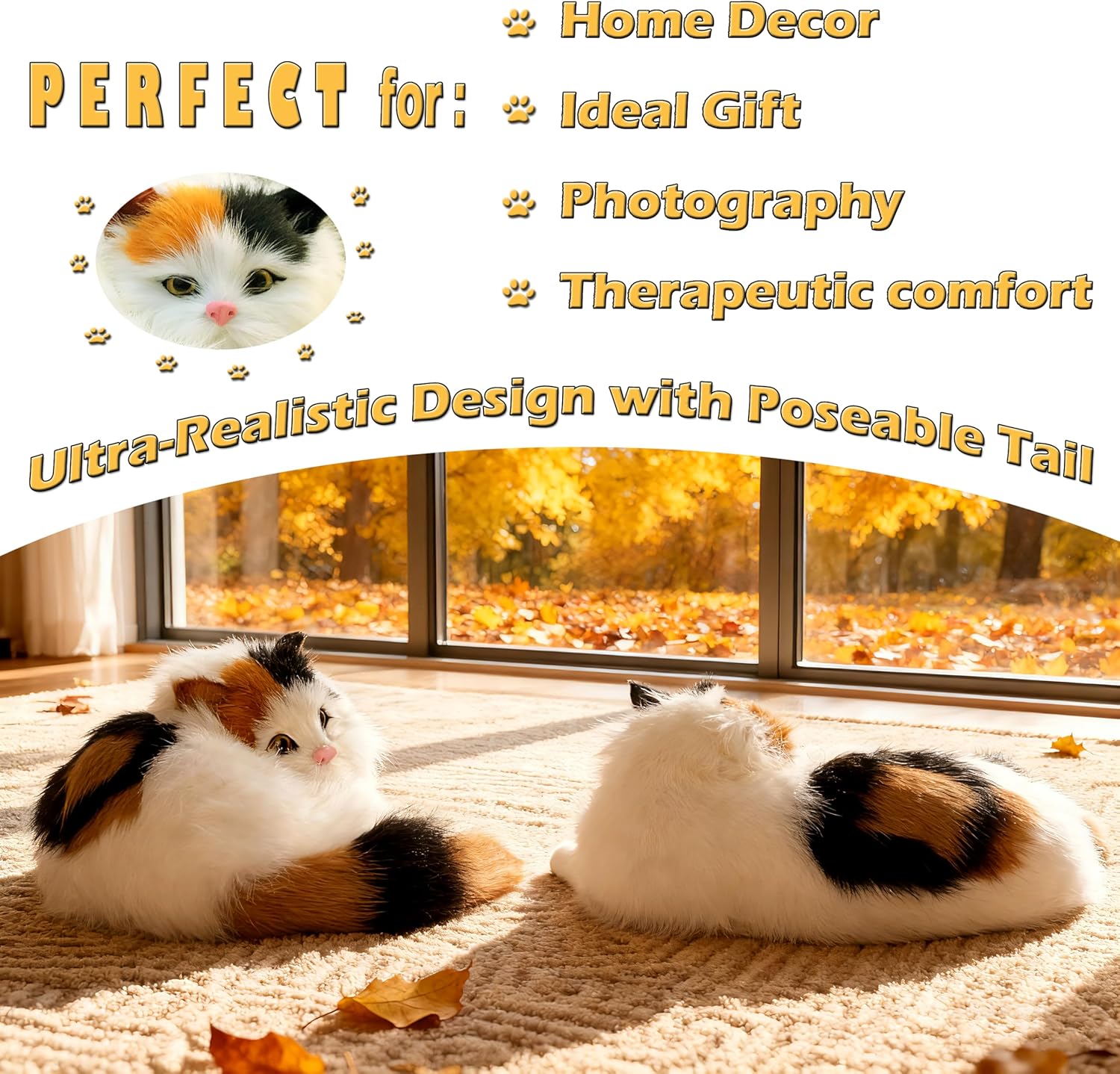 - UNBELIEVABLY LIFELIKE & POSEABLE Handcrafted for stunning realism, this calico kitten features authentic tri-color patterns, expressive glass-like eyes, and a poseable tail you can bend into natural, adorable positions. The high-quality, soft fluffy fur brings this furry critter to life.